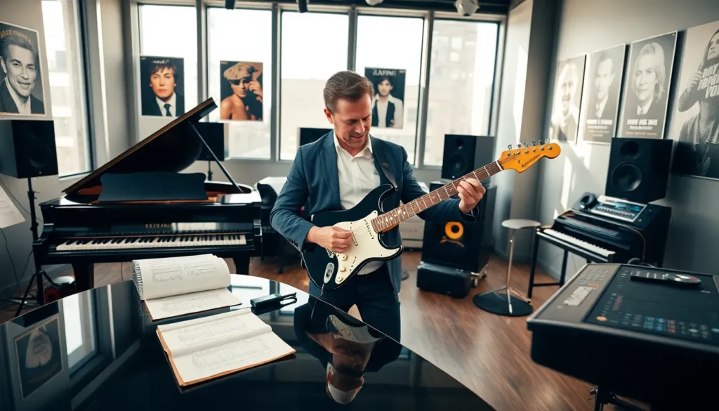 diverse musicians collaborating in a modern music studio.